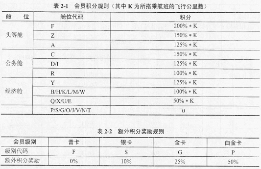 某航空公司的会员卡分为普卡、银卡、金卡和白金卡4个级别,会员每次搭乘该航空公司航班均可能获得积分,积分规则如表2-1所示。此外,银卡及以上级别会员有额外积分奖励,奖励规则如表2-2所示。