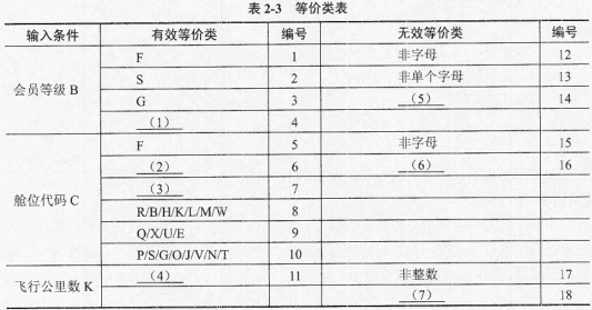问题:2.1   采用等价类型划分法对该程序进行测试,等价类表如2-3所示,请补充空(1)-(7)。