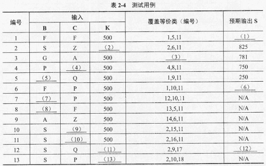 问题:2.2   根据以上等价类表设计的测试用例如表2-4所示,请补充空(1)~(13)。