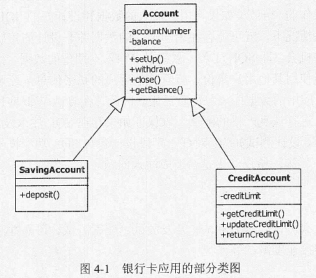 图4-1是银行卡应用的部分类图,图中属性和操作前的“+”和“-”分别表示公有成员和私有成员。银行卡Account有两种类型,借记卡SavingAccount和信用卡CreditAccount 。