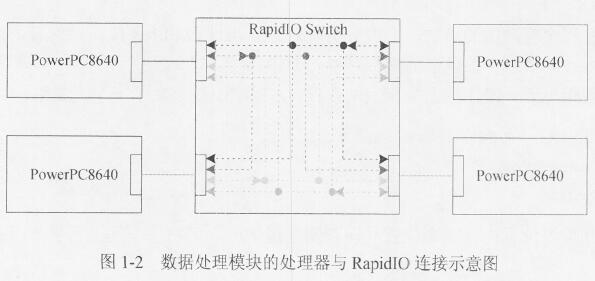 为了提高综合处理系统的处理速度,主要处理模块都设计为多个处理器。其中,数据处理模块有4片PowerPC8640处理器,通过RapidlO内部网络连接,如图1-2所示。