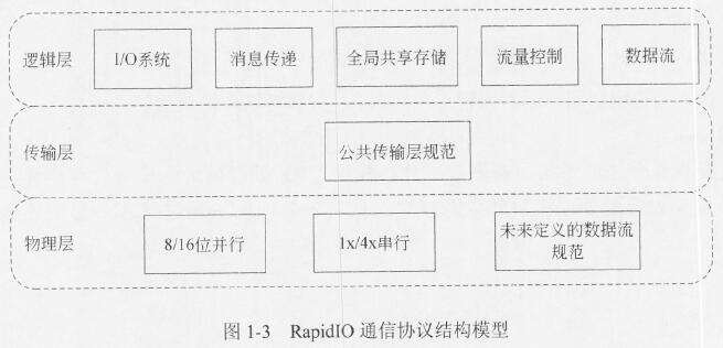 串行RapidlO协议即SR1O通信协议,构建了3层的协议体系。如图1-3所示,分别是物理层、传输层、逻辑层。物理层定义了硬件接口的电器特性,并包括链路控制、初级流量控制和低级错误管理等功能;传输层负责进行寻址和路由信息管理;逻辑层定义了服务类型和包交换的格式。