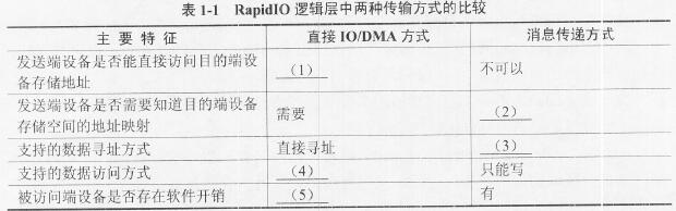 问题:1.2   RapidlO逻辑层中直接IO/DMA和消息传递这两种传输方式的主要差异如表1-1所示。请完成表中的内容,将表1-1中的(1)~(5)答案填写在答题纸的对应栏中。