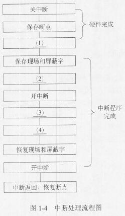 问题:1.3   在IO处理模块等多个模块上,都采用中断方式处理输入输出。在中断处过程包括关中断、保存断点、识别中断源等一系列步骤,如图1-4所示,请完成其中的填空,将答案填写在答题纸的对应栏中。