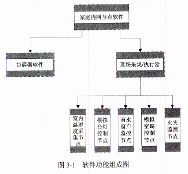 智能家居系统软件设计中,家庭内网节点软件设计包括协调器软件、现场采集/ 执行器(室内温湿度采集节点、模拟台灯控制节点、模拟雨水窗户监控节点、模拟空调控制节点和火灾检测节点)的软件设计。软件功能组成如图3-1所示。