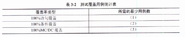 请指出对上述算法达到100%语句覆盖、100%条件覆盖和100%MC/DC覆盖所需的最少测试用例数目,填写在表3-2的空(1)〜(3)中。