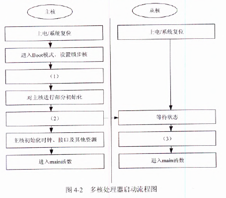 该ECU系统在上电、复位或唤醒后,首先进入Boot模式,进行开或者关,对FLASH 和RAM进行初始化,然后进入用户程序,用户程序是从cstart函数开始执行的,在多核嵌入式系统中通常是先进行主核的cstart,主核自身进行部分初始化后将从核从HALT 状态激活,然后主核和从核在完成各自必要的设置后分别进入各自的main函数。图4-2 是该系统多核处理器的启动流程,请补充空(1)〜(3)的内容,将解答填写在答题纸的对应栏中。