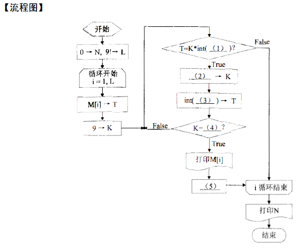 该流程图中,数组M存储着全部由数字1~9的排列组成的9!个整数,对其中每个整数,分别按K=9,8,···2,取前K位数字构成的数(用T表示),判断T是否能被K整除。变量N用于计算符合条件的整数的个数。