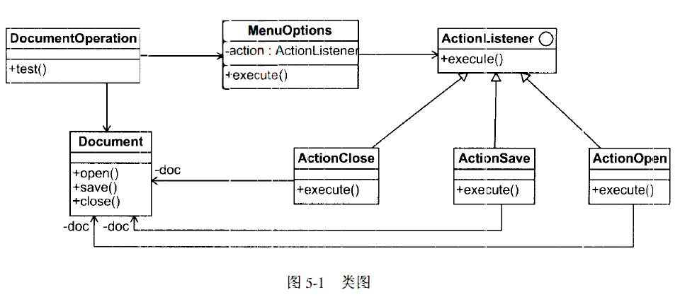 问题:5.1         对某简单文档编辑器中的文档(Document)打开、存储和关闭操作功能进行设计,得到图5-1所示的类图,其中,DocumentOperation定义对文档的操作,通过菜单项( MenuOptions )选择执行相应的打开、存储和关闭操作。