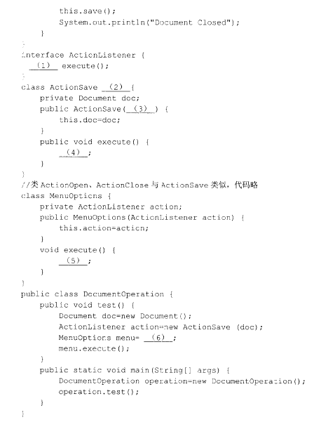 下面的Java代码实现上述设计,请完善代码中的空( 1 )~(6)。