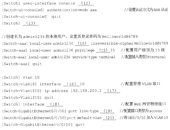为了能在后续的维护中对交换机进行远程管理,需要为交换机配置(4)。根据公司的地址规划,该地址一般与公司网络的(5)VLAN地址处于同一网段。如果公司规划的管理VLAN网段为192.168.200.0/28,配置时应使用的子网掩码是(6)。