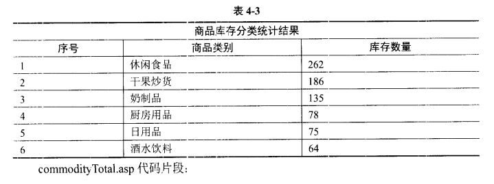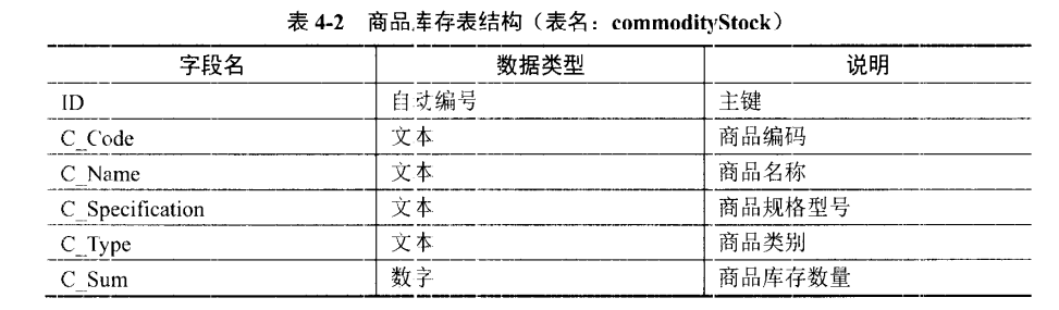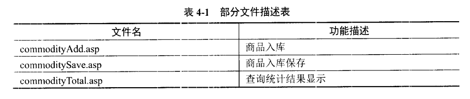 某小型超市商品库存信息管理系统可以实现商品入库、商品销售出库、库存统计等管理功能。开发语言为ASP,部分程序文件功能描述如表4-1所示。所有数据均存储在Access数据库中,数据库文件名为commodityManagemdb,商品库存表数据结构如表4-2所示。