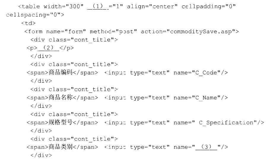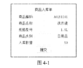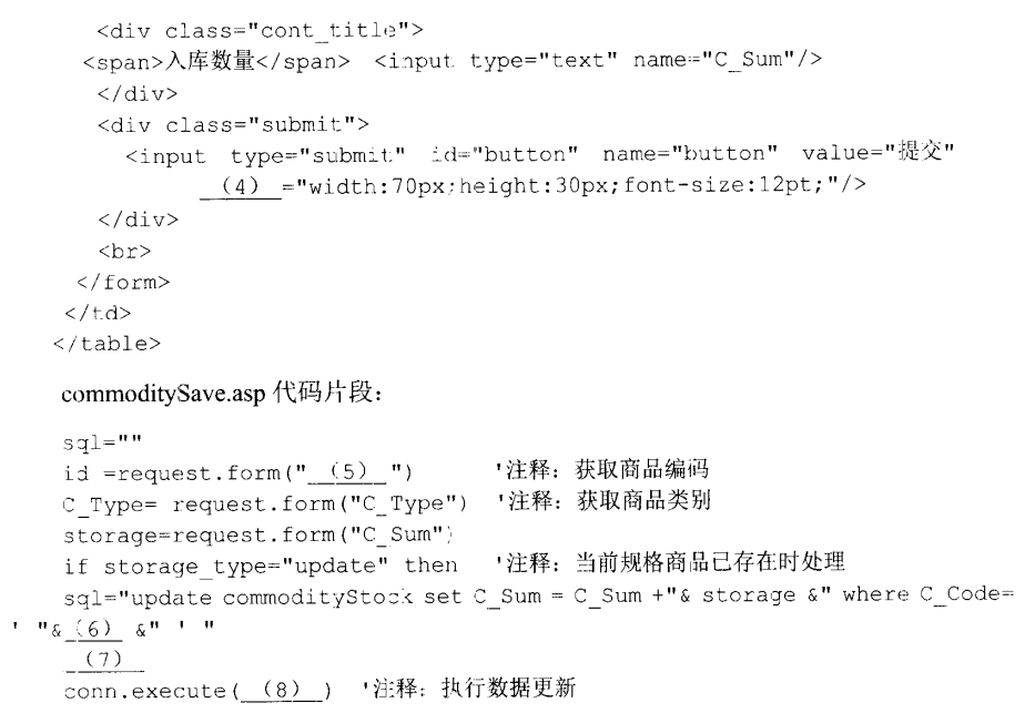 以下所示代码为商品入库的代码片段,图4-1为商品入库操作界面截图。请将(1)~(8)的空缺代码补齐。