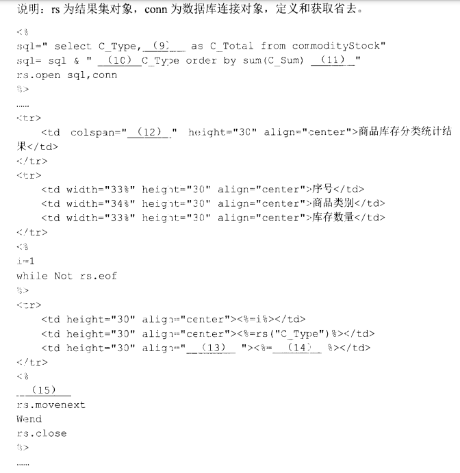 以下是根据商品类别对库存进行分类统计并显示的程序代码片段,表4-3所示为商品库存类别统计结果示例。请将(9)~(15)的空缺代码补齐。