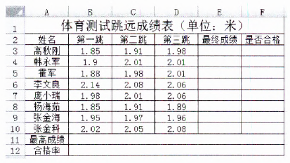 3.用IF函数计算选手是否合格,有一次成绩达到2米以上即在对应的单元格中显示“合格”,否则显示“不合格”。