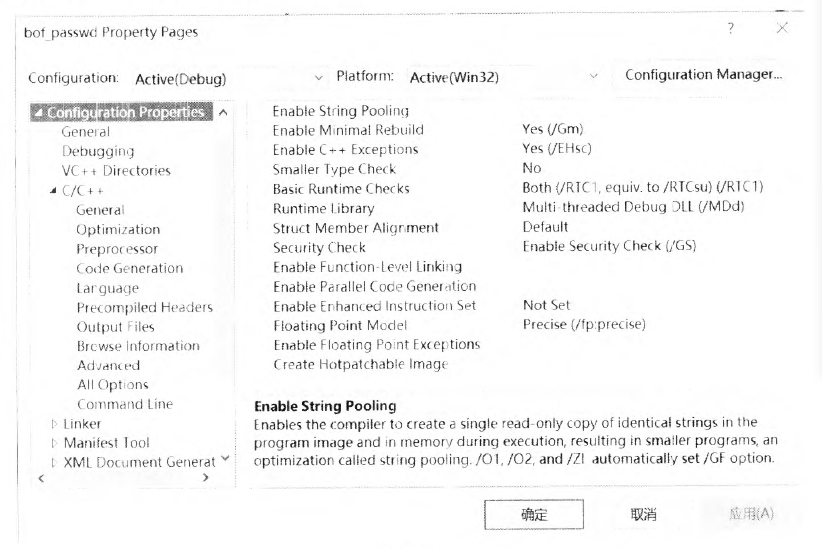 微软的Visual Studio提供了很多安全相关的编译选项,图5-3给出了图5-1中代码相关的工程属性页面的截图。请回答以下问题。