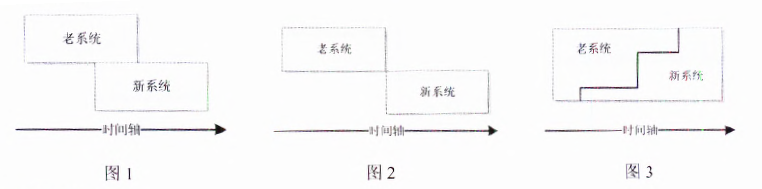 请写出图1、图2、图3所表示的新旧系统转换方式的名称,并说明每种转换方式的优缺点。