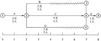 在项目某阶段的实施过程中,A活动需要2天2人完成,B活动需要2天2人完成, C活动需要5天4人完成,D活动需要3天2人完成,E活动需要1天1人完成,该阶 段的时标网络图如下。该项目组共有8人,且负责A、E活动的人因另有安排,无法帮助其他人完成相应工作,且项目整个工期刻不容缓。以下(24)安排是恰当的,能够使实施任务顺利完成。