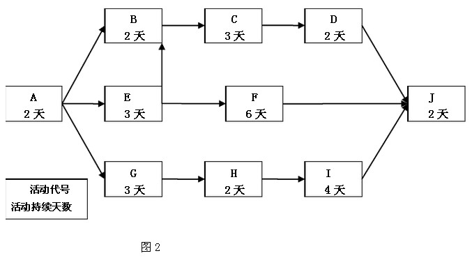 项目经理在为某项目制定进度计划时绘制了如下所示的前导图(如图2所示)。图中活动E和活动B之间为结束-结束关系,即活动E结束后活动B才能结束,其他活动之间的关系为结束-开始关系,即前一个活动结束,后一个活动才能开始。