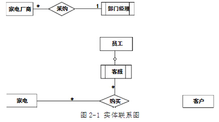 需求分析】 (1)系统需要维护电子商务公司的员工信息、客户信息、家电信息和家电厂商信息等。员工信息主要包括:工号、姓名、性别、岗位、身份证号、电话、住址,其中岗位包括部门经理和客服等。客户信息主要包括:客户ID、姓名、身份证号、电话、住址、账户余额。家电信息主要包括:家电条码、家电名称、价格、出厂日期、所属厂商。家电厂商信息包括:厂商ID、厂商名称、电话、法人代表信息、厂址。 (2)电子商务公司根据销售情况,由部门经理向家电厂商订购各类家电。每个家电厂商只能由一名部门经理负责。 (3)客户通过浏览电子商务公司网站查询家电信息,与客服沟通获得优惠后,在线购买。