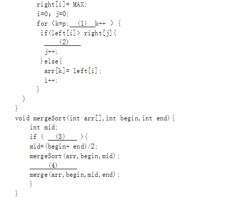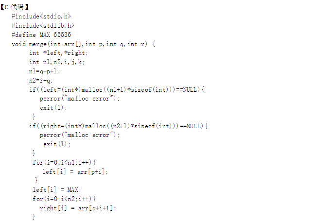 采用归并排序对n个元素进行递增排序时,首先将n个元素的数组分成各含n/2个元素的两个子数组,然后用归并排序对两个子数组进行递归排序,最后合并两个已经排好序的子数组得到排序结果。 下面的C代码是对上述归并算法的实现,其中的常量和变量说明如下: