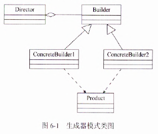 生成器(Builder)模式的意图是将一个复杂对象的构建与它的表示分离,使得同样的构建过程可以创建不同的表示。图6-1所示为其类图