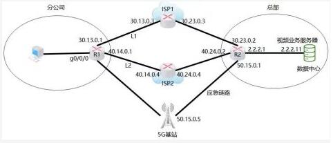 图为某公司的总部和分公司网络拓扑,分公司和总部数据中心通过ISP1的网络和ISP2的网络互连。并且连接5G出口作为应急链路,分公司和总部数据中心交互的业务有语音视频FTP和 HTTP四种。要求通过配置策略路由实现分公司访问业务分流。配置网络质量分析(NOA)与静态路由联动实现链路冗余。其中,语音视频以ISPI为主链路、ISP2为备份:FTP和HTTP以ISP2为主链路,ISP1为备份。