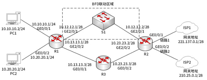 [R1] ip route-static 0.0.0.0 0.0.0.0 GigabitEthemet2/0/1 (3) track (4) R1 to R2 //配置R1的缺省路由,联动BFD使得R1到2的流量优先走R1->S1->R2链路,当此链路发生故障时,流量切换到R1->R3->R2链路上