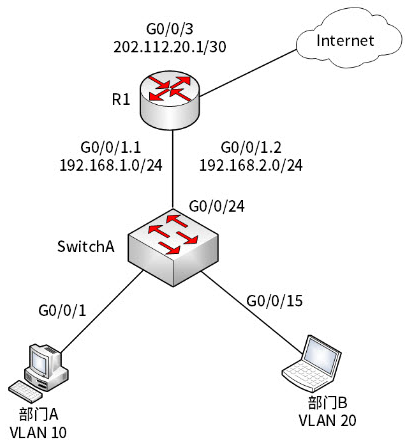 某公司网络拓扑如图4-1所示,有A和B两个部门,分别使用C类地址192.168.1.0/24和192.168.2.0/24两个私用地址段,其中部门A为固定办公区域,部门B为移动办公区域。两个部门均有访问互联网的需求。