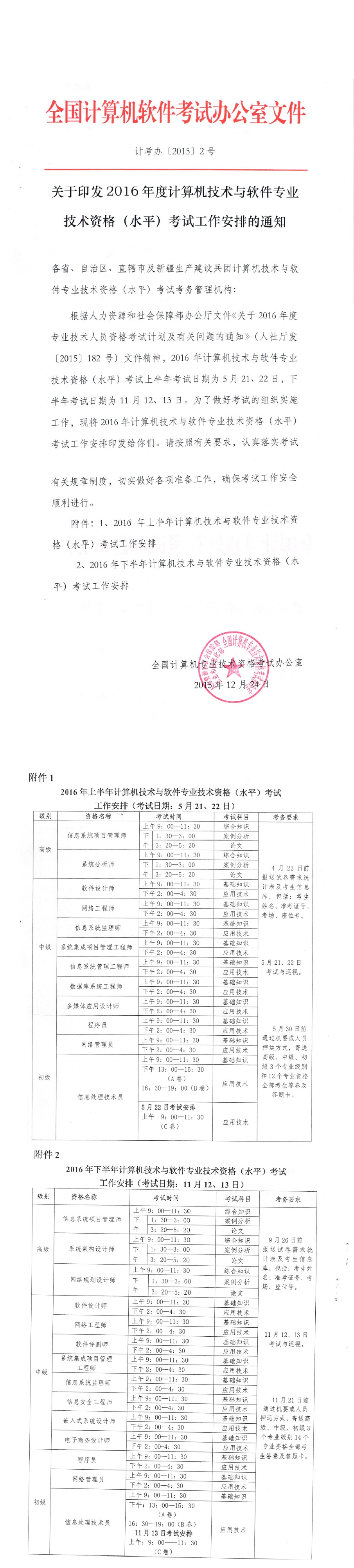 2016年计算机技术与软件专业技术资格(水平)考试安排