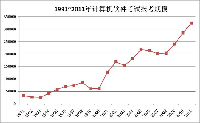 1991-2011年全国计算机软件资格考试规模的发展情况见下图: