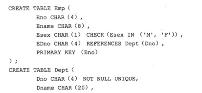 设有职工关系 Emp (Eno,Ename,Esex, EDno)和部门关系Dept (Dno,Dname,Daddr),创建这两个关系的SQL语句如下: