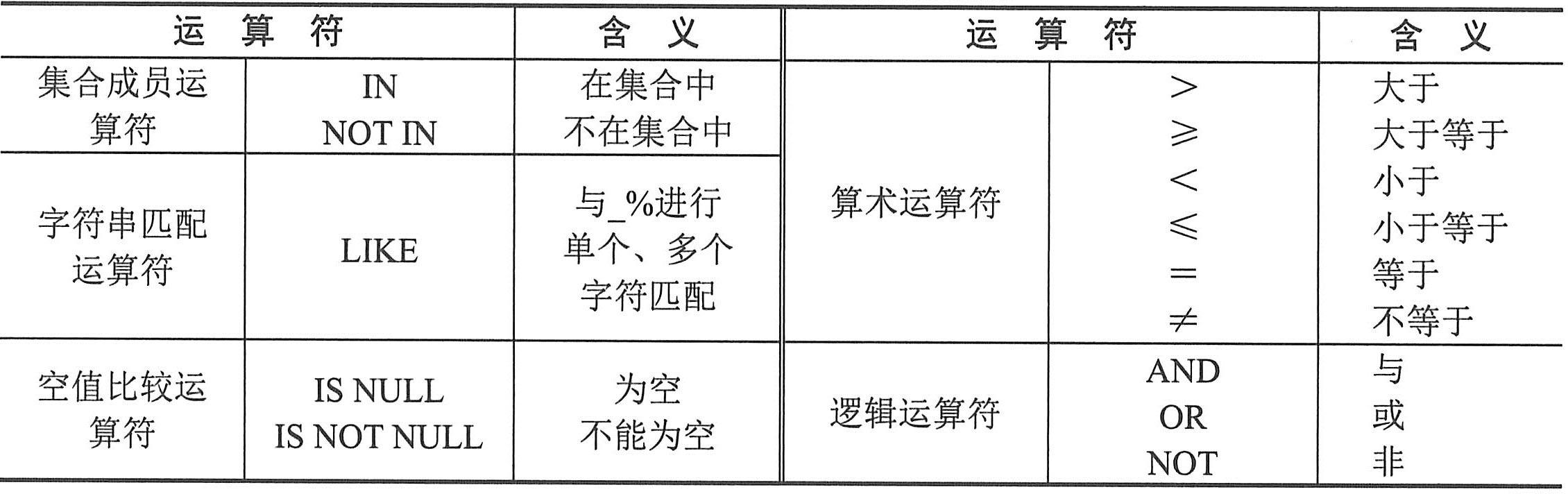 (3)WHERE子句对应的是关系代数中的选择谓词。WHERE子句的条件表达式中可以使用的运算符如下表所示。