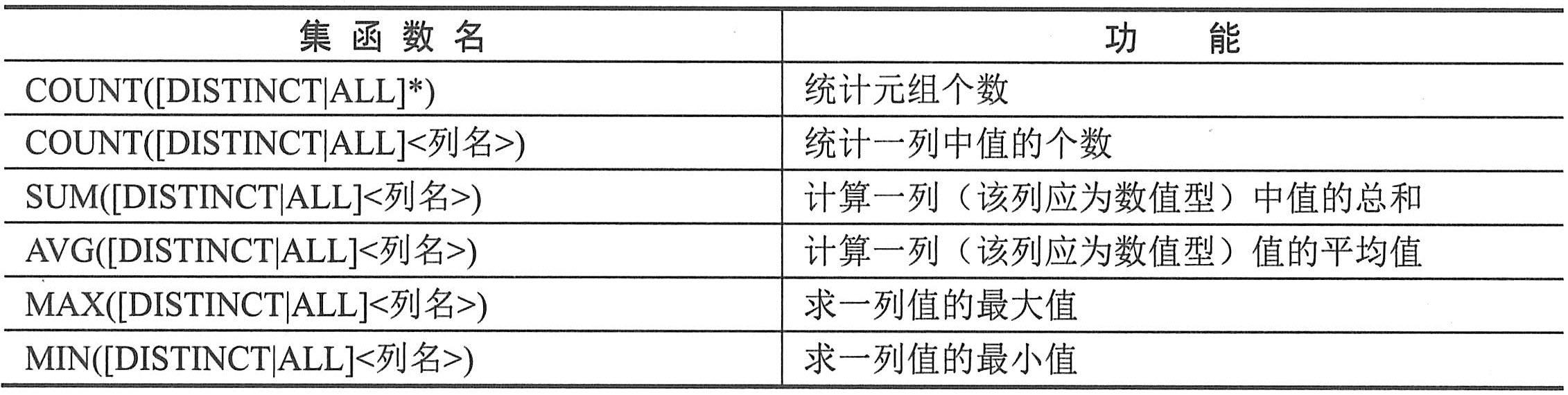 聚集函数是一个值的集合为输入,返回单个值的函数。SQL提供了5个预定义集函数:平均值avg、最小值min、最大值max、求和sum以及计数count。如下表所示。
