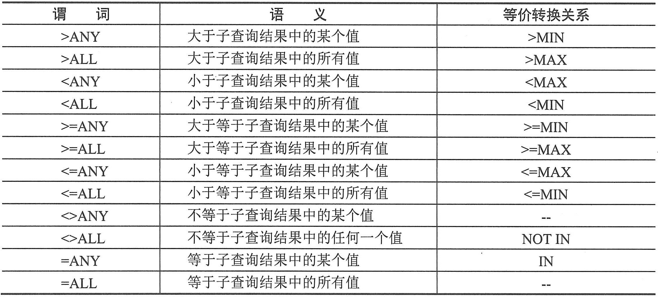 使用ANY和ALL谓词必须同时使用比较运算符,其含义及等价的转换关系如下表所示。用集函数实现子查询通常比直接用ALL或ANY查询效率要高。