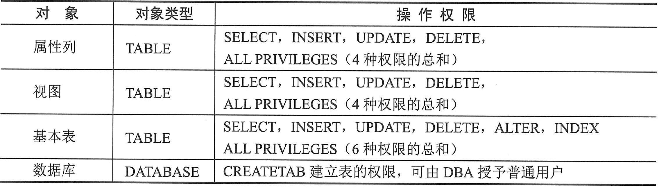 注意:若指定了WITH GRANT OPTION子句,那么获得了权限的用户还可以将权限赋给其他用户;接受权限的用户可以是单个或多个具体的用户,PUBLIC参数可将权限赋给全体用户。不同类型的操作对象有不同的操作权限,常见的操作权限如下表所示。