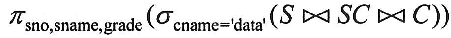 因为涉及3个关系模式SSCC,为了转换成等价的元组演算表达式,需要设置3个元组变量uvw,而且这3个元组变量只要用存在量词?限定就可以了。(?uSu)表示在S关系中存在一个元组,(?vSCv)表示在SC关系中存中一个元组,(?wCw)表示在C关系中存在一个元组。因为u[1]对应的是S.Sno,v[1]对应的是SC.Sno,v[2]对应的是SC.Cno,w[1]对应的是C.Cno,w[2]对应的是C.Cname,所以S.Sno=SC.Sno且SC.Cno=C.Cno且Cname=′data′等价于u[1]=v[1]∧v[2]=w[1]∧w[2]=′data′。因为本题的结果集为Sno、Sname和Grade,而u[1]对应的是S.Sno,u[2]对应的是S.Sname,v[3]对应的是SC.Grade,所以对属性列Sno、Sname和Grade的投影等价于t[1]=u[1]∧t[2]=u[2]∧t[3]=v[3]。因此,与等价的元组演算表达式为{(?u)(?v)(?wSu)∧SCv)∧Cw)∧u[1]=v[1]∧v[2]=w[1]∧w[2]=′data′∧t[1]=u[1]∧t[2]=u[2]∧t[3]=v[3]}。