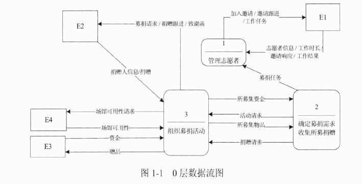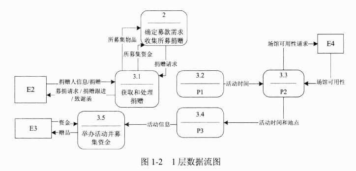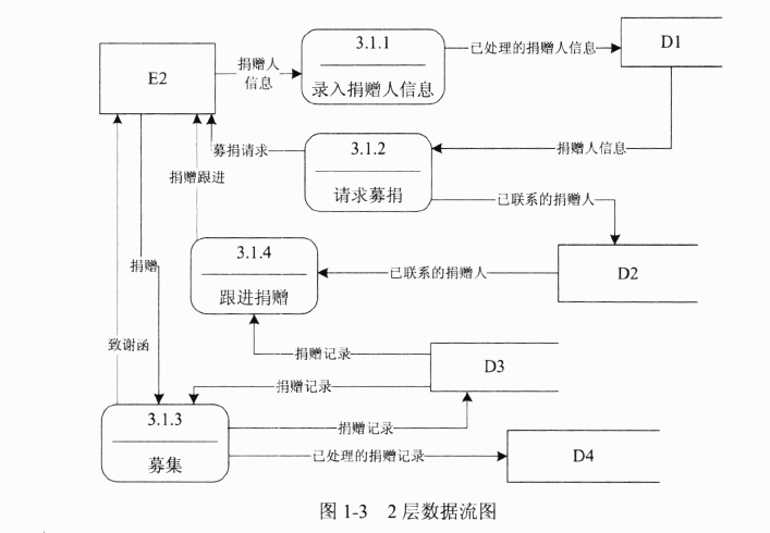 现采用结构化方法对募捐系统进行分析与设计,获得如图1-1、1-2和1-3所示分层数据流