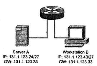 在下图所示的网络配置中,发现工作站B无法与服务器A通信。( ),故障影响了两者互通。