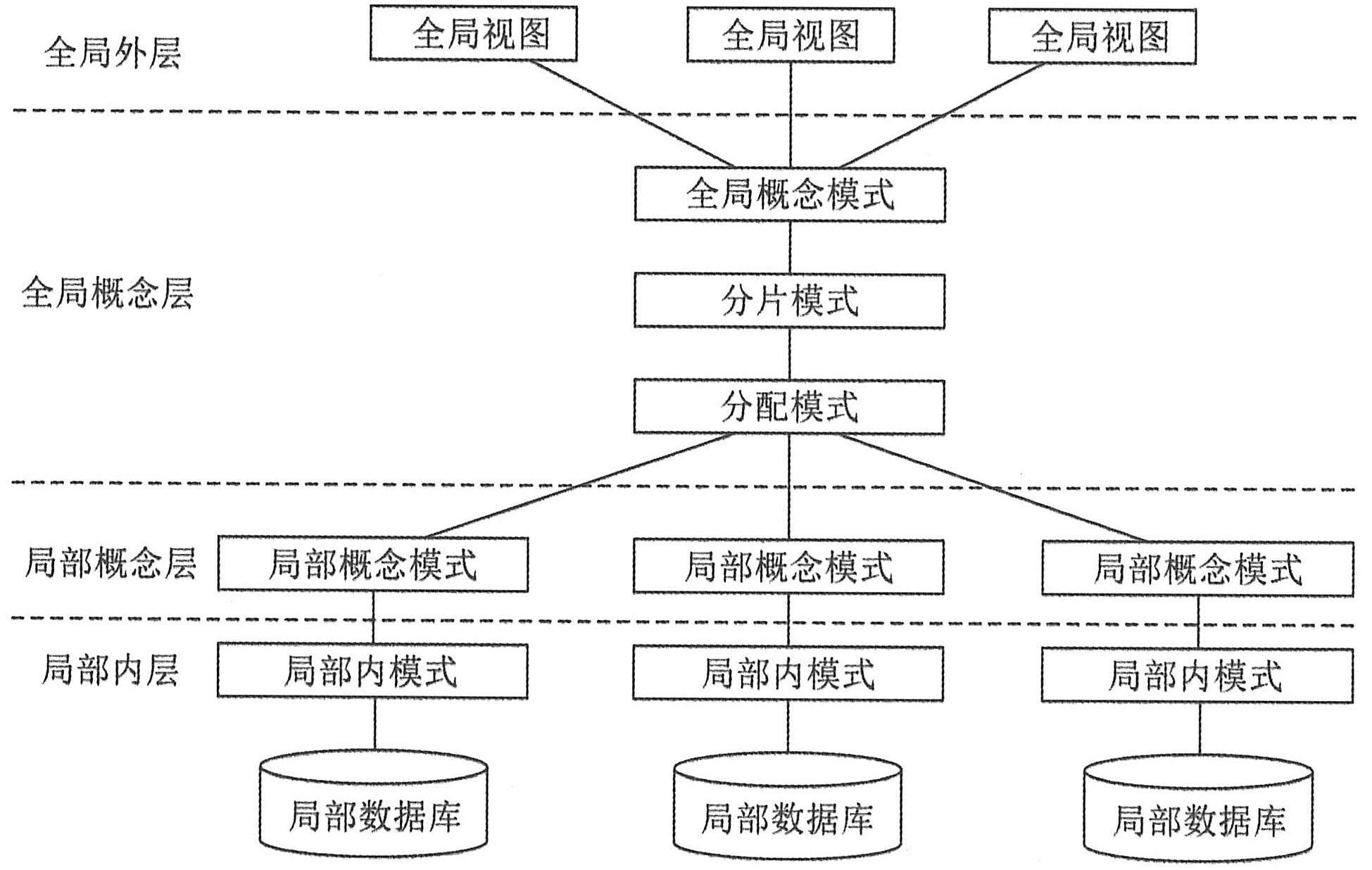 我国在多年研究与开发分布式数据库及制定我国的《分布式数据库系统标准》中,曾提出把分布式数据库抽象为四层的模式结构,参见下图。