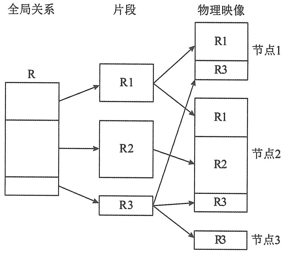 如下图是全局关系R的分片和物理映像示意图。全局关系R分为三个片段R1、R2和R3,以冗余的方式分配到不同物理节点上。R1在节点1和节点2有相同的映像,R2只在节点2上存储,R3在节点1、节点2和节点3上都有相同的映像副本。