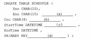 问题:2.1   请将下面创建调度关系的SQL语句的空缺部分补充完整,要求指定关系的主码、外码,以及调度表中每天安排发车的时间在上午07:00:00至下午18:00:00范围内的约束(由函数Time Get_time(DATETIME StartTime)返回出车的时间)。