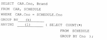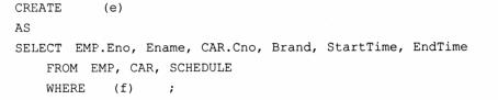 问题:2.2   (1)创建所有'奥迪'品牌汽车的调度信息的视图AudiSCHEDULE,属性有Eno、Ename、Cno、Brand、StartTime和EndTime,请将下面SQL语句的空缺部分补充完整。