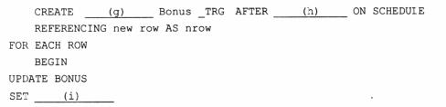 (2)驾驶员的奖金在收车时间写入时,由出车时间段自动计算,并用触发器来实现奖金的自动维护,函数float Bonus_value(DATETIME StartTime, DATETIME EndTime)依据发车时间和收车时间来计算本次出车的奖金。系统在每月初自动增加一条该员工的当月奖金记录,初始金额为零。请将下面SQL语句的空缺部分补充完整。