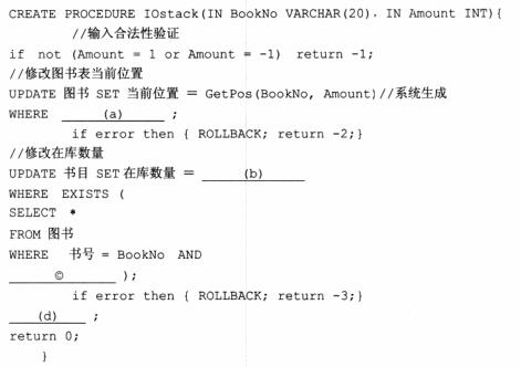 阅读下列说明,回答问题1和问题2,将解答填入答题纸的对应栏内。 【说明】 某图书馆的图书借还业务使用如下关系模式: 书目(ISBN,书名,出版社,在库数量) 图书(书号,ISBN,当前位置) 其中在库数量为当前书目可借出的图书的数量,每本图书入库后都会有当前位置,借出后当前位置字段改为空值。每一条书目信息对应多本相同的图书,每一本图书只能对应一条书目。 借还书业务的基本流程如下描述: (1)读者根据书名查询书目,当前书目的在库数量大于0时可借阅。 (2)读者借出一本图书时,进行出库操作:根据该图书的书号将该图书的当前位置字段值改为空值,并根据其ISBN号将对应书目的在库数量减1。 (3)读者归还一本图书时,进行入库操作:系统根据当前书架的空余位置自动生成该本书的存放位置,并根据该图书的书号将其当前位置字段值改为生成的存放位置,然后将对应书目的在库数量加1。 (4)借还书时,逐一扫描每本图书的书号并进行出、入库操作。