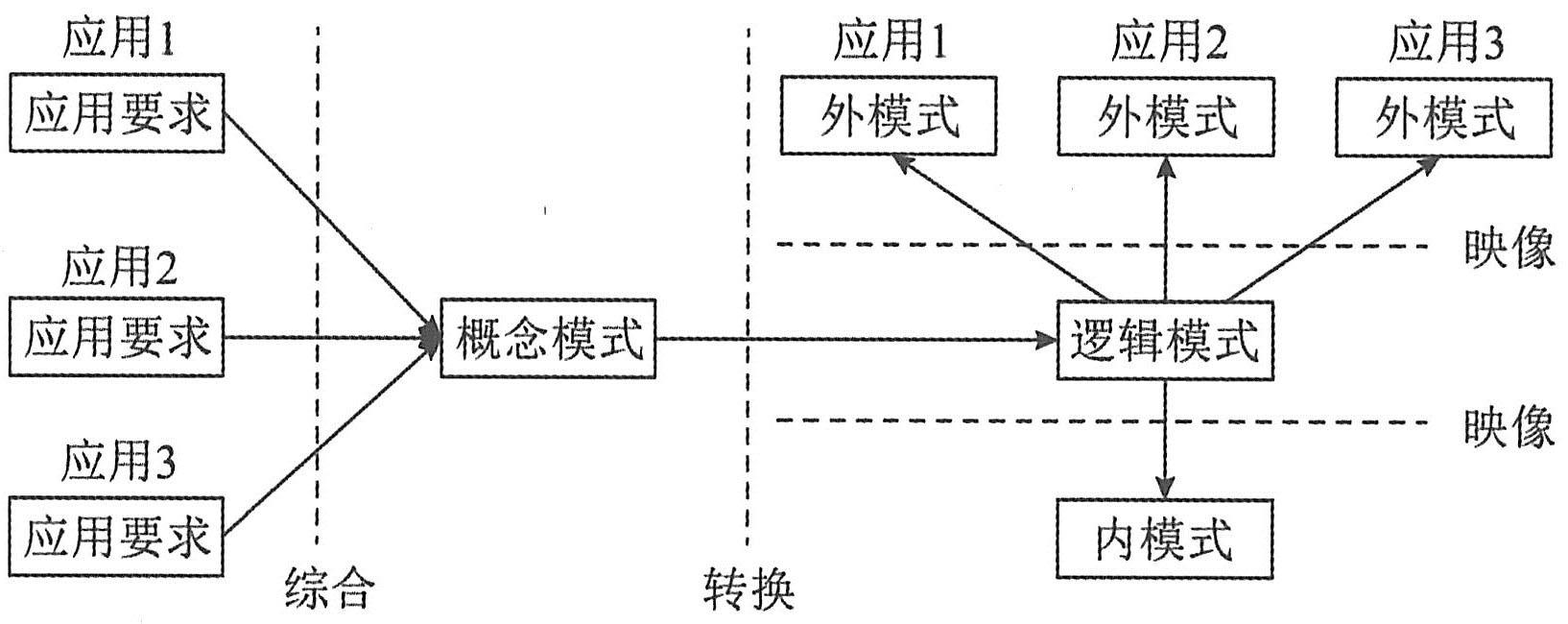 概念结构设计的目标是产生反映系统信息需求的数据库概念结构,即概念模式。概念结构是独立于支持数据库的DBMS和使用的硬件环境的。此时,设计人员从用户的角度看待数据以及数据处理的要求和约束,产生一个反映用户观点的概念模式,然后再把概念模式转换为逻辑模式。各级模式之间的关系如下图所示。