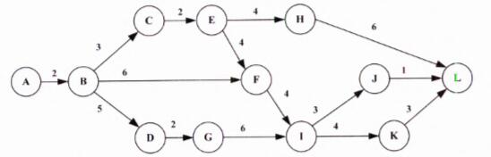 某软件项目的活动图如下图所示,其中顶点表示项目里程碑,连接顶点的边表示包含的活动,边上的数字表示活动的持续天数,则完成该项目的最少时间为(27)天。活动EH和IJ的松弛时间分别为(28)天。