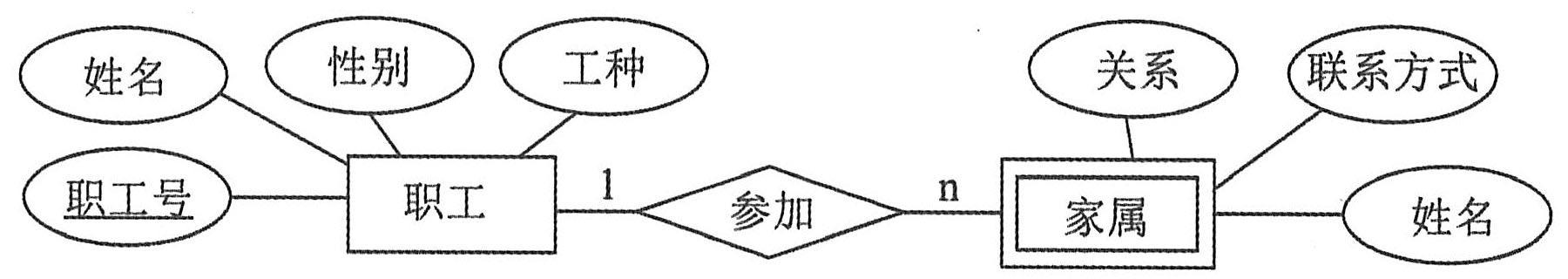 在扩展的E-R图中,弱实体用双线矩形框表示。下图为职工与家属的E-R图。