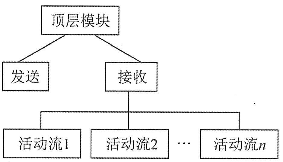 (2)将事务流型DFD映射成高层的程序结构。事务流型DFD的高层结构如下图所示。顶层模块的功能就是整个系统的功能。接收模块用来接收输入数据,它对应于输入流。发送模块是一个调度模块,控制下层的所有活动模块。每个活动流模块对应于一条活动流,它也是该活动流映射成的程序结构图中的顶层模块。