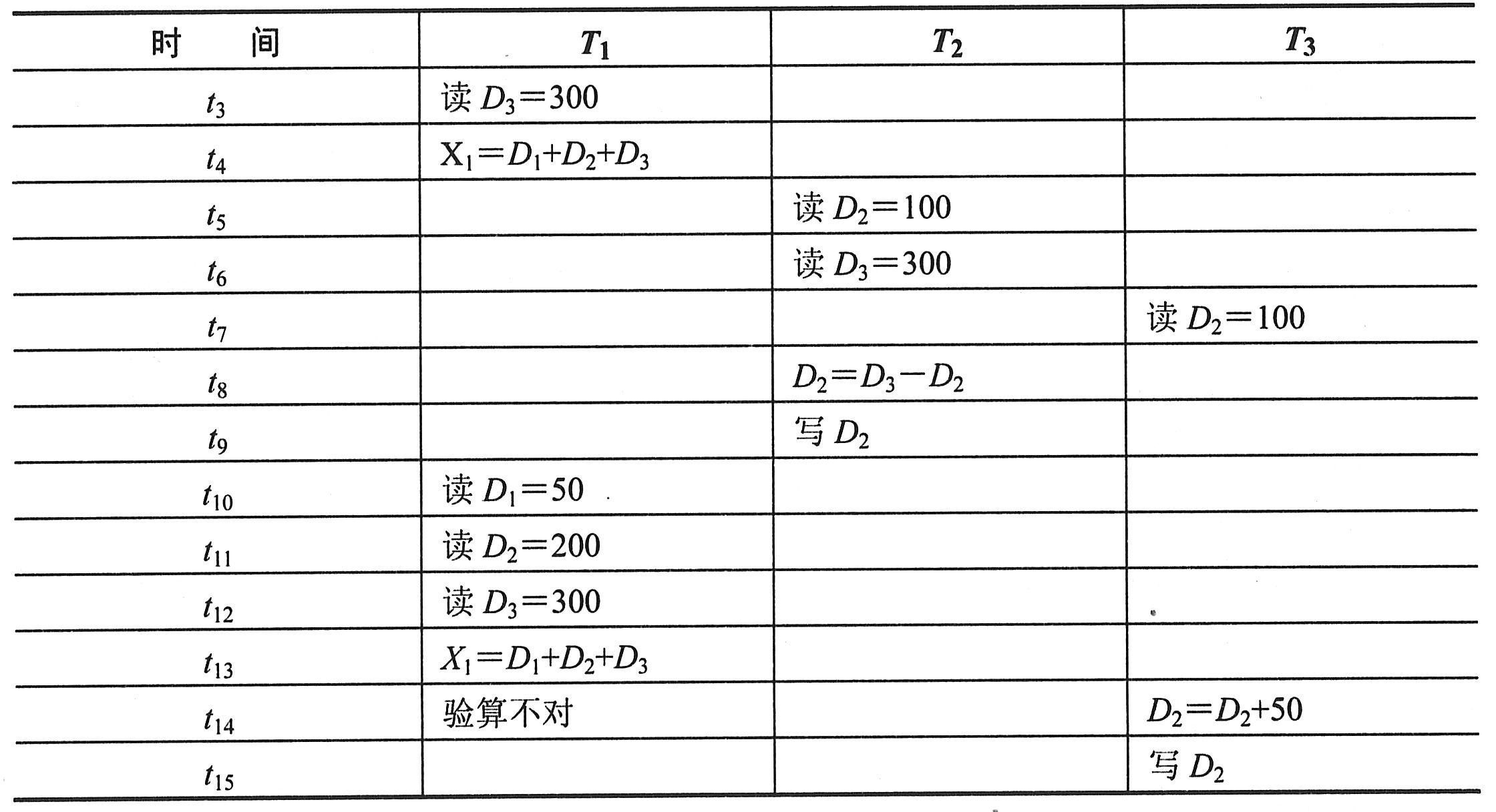 在上表中,事务T1T2分别对数据D1D2D3进行读写操作,在t4时刻,事务T1D1D2D3相加存入X1X1等于450。在t8时刻,事务T2D3减去D2存入D2D2等于200。在t13时刻,事务T1D1D2D3相加存入X1X1等于550,验算结果不对。这种情况就属于不可重复读。在t14时刻事务T3D2加50存入D2D2等于150。这样,就丢失了事务T2D2的修改,这种情况就属于丢失更新。